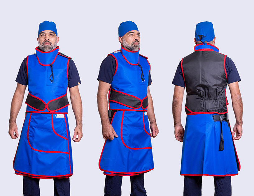 Chaleco de protección radiológica modelo PVEST (para falda). Protección equivalente a 0.5 mm de plomo. El chaleco provee excelente soporte lumbar y distribución del peso de la protección. Su cierre elástico descarga peso del chaleco de los hombros a la cadera.