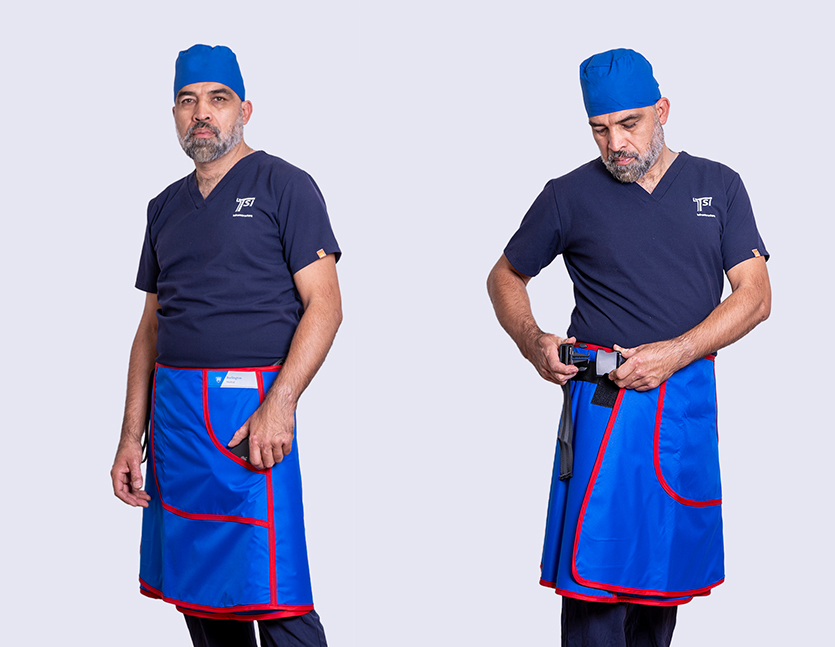 Falda de protección radiológica modelo KILT. Protección equivalente a 0.5 mm de plomo. Los cierres frontales de velcro permiten una fácil colocación. Su bolsa grande frontal permite guardar esenciales durante su trabajo.